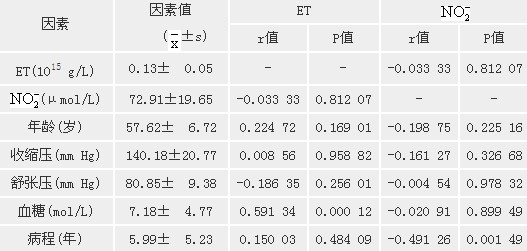 2.检测方法:(1)血标本:取空腹肘静脉血4 ml,其中2 ml置于含10%依地酸二钠30 μl和抑肽酶40 μl的试管中混匀,离心取血浆,分为2份,-20℃冰箱保存待检。另外2 ml测定血糖。采血同时测量卧位右臂血压,记录年龄、性别及病程等临床资料。(2)ET测定:采用解放军总医院东亚免疫技术研究所提供的ET试剂盒,按其放射免疫测定(radioimmuoassay, RIA)操作程序,使用美国Cap-Ria16型自动γ计数器检测,根据标准曲线直接计算ET含量。(3)NO测定:试剂盒由第四军医大学自由基生物学教研室提供。取室温下复融的血标本上清液20 μl,经去脂肪、去蛋白、离心后加入10 μl 2,3-二氨基萘盐酸生成荧光物质,以NaOH终止反应,加双蒸水3 ml,用日本RF-5000型荧光分光光度计测量标本的荧光强度,间接反映NO稳定的代谢产物亚硝酸盐(