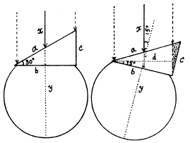 1.1 现有棱镜术中光学成像分析 以30°棱镜为例,取其最大矢状位剖面和眼球最大剖面作示意图分析如下(图1)。已知棱镜的上镜面(a)与下镜面(b)之间的夹角为30°,底边(c)与下镜面(b)垂直。设显微镜光线(x)由上向下垂直射入眼内。当眼球的眼轴(y)与光线(x)平行时,棱镜的下镜面(b)与光线(x)相垂直。术中为发挥该30°棱镜的最佳成像效果,眼轴(y)至少应倾斜15°以上,即至少使棱镜的角平分线(d)与光线(x)垂直。此时,棱镜底边(c)与上镜面(a)之间便出现一个三角形非成像部分(图中阴影部分)。该非成像部分的面积随着眼轴(y)的进一步倾斜[即上镜面(a)与光线(x)的进一步接近垂直]而渐扩大,从而使上镜面(a)的可利用部分进一步缩小。由以上分析可知:当眼轴(y)倾斜15°(即1/2棱镜度数)时,棱镜的上镜面得到最大程度的光学利用,此时上镜面(a)的可利用面积与下镜面(b)相等。