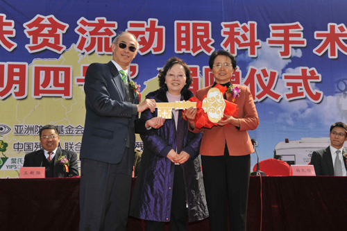 此次手术车捐赠仪式于2011年3月23日在济南市中心的泉城广场隆重举行。山东省副省长王随莲、省政协副主席王新陆、省人大原副主任严庆清、省政府副秘书长张传亭、省卫生厅副厅长袭燕、省残联仉兴玉理事长、省残联副理事长牟顺娥、省立医院副院长秦成勇、省卫生学校原校长李春华等领导亲临现场,与亚洲防盲基金会行政总裁陈梁悦明太平绅士、叶氏化工执行董事杨民俭、叶氏化工紫荆花漆总经理叶钧共同出席了捐赠仪式。活动期间,主办方还安排了此前刚通过该项目治愈眼疾的两位白内障病患者观礼,让诸位来宾通过参观手术车设备和分享病愈者的欢乐来进一步加深对项目的认识。