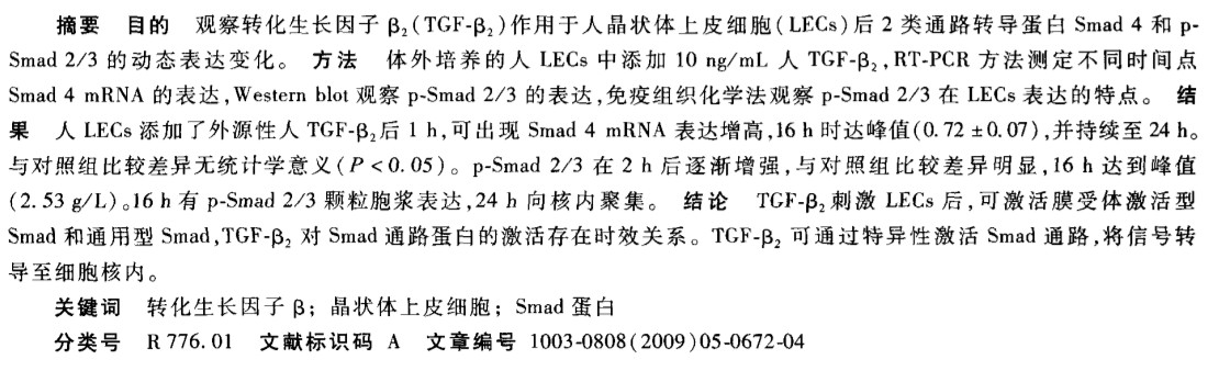 TGF-β2作用于人晶状体上皮细胞后Smad 4与p-Smad2/3的动态表达