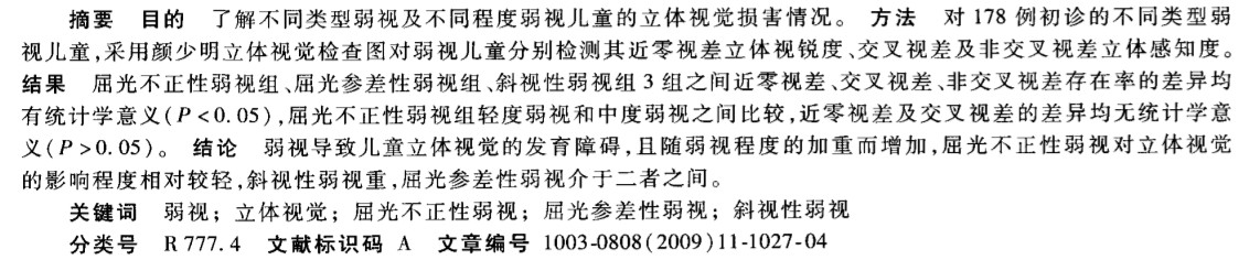 不同类型及程度弱视患儿的立体视觉现状评价