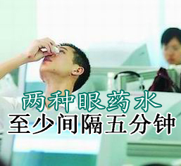 如果需要用两种眼药,至少应间隔5分钟。有的则需要间隔更长时间,如用于抗细菌(如治红眼病)的眼药水,与抗病毒的眼药水同时使用,必须间隔30分钟以上。