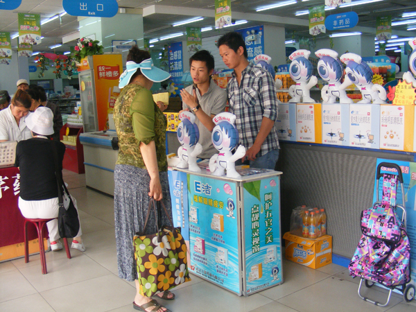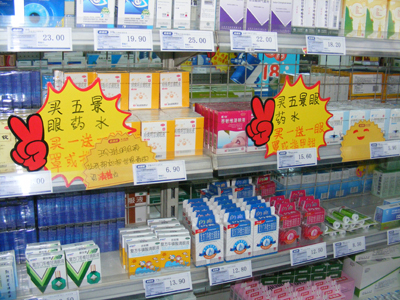 在2011年6月6日爱眼日来临之际,武汉五景药业在北京老百姓药店举办了优惠活动:买眼药水增眼罩或指甲钳,同时针对现在视疲劳患者越来越多,推荐E洁系列眼药水,现在群众纷纷上前咨询并购买。