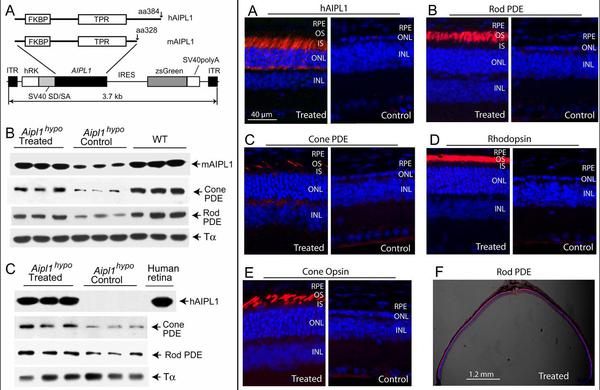 AAV病毒携带AIPL1基因,移植到视网膜下腔,可修复感光细胞磷酸二酯酶的生物合成,从而治疗RP等感光细胞变性疾病