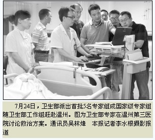 22时15分,浙江省卫生厅决定派出3支省级医疗队紧急赴温州开展医疗救援。同时,协调距离温州较近的台州市、丽水市各组织两支医疗队,火速赶赴事故现场;指示正在温州参加浙江省ICU主任年会的39位专家分赴各医院参与救治;