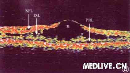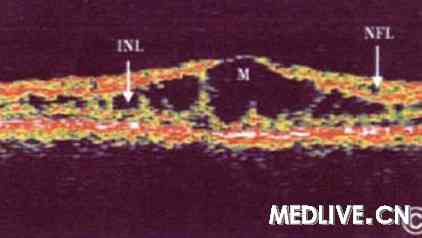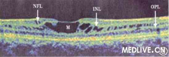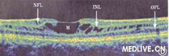 相干光断层扫描是目前检查本病的最佳方法,因其操作无创伤且安全,更易为儿童接受。由于是断层扫描,故囊泡的所在部位清晰可见,同时可测量视网膜病变区的厚度。囊泡可位于视网膜的神经纤维层、节细胞层、内核层、外从状层或光感受器细胞层等,囊泡可被斜形或垂直的条状组织结构分开。相干光断层扫描检查视网膜神经纤维层,显示单眼变薄者占62.5%,双眼变薄者占37.5%;其中41.7%患者为1个象限的视网膜神经纤维层变薄,超过2个象限神经纤维层变薄者占33.3%;以下方象限变薄者占50%;颞侧象限占33.3%、鼻侧象限占16.7%、上方象限占16.7%。有文献报道5例33~65岁的患者无黄斑中心区囊样改变,相干光断层扫描检查黄斑中心区视网膜厚度为126—190μm,平均156μm。明显变薄。也有的患者发生神经上皮层增厚或神经上皮层脱离。年龄较大的患者晚期可发生黄斑板层裂孔。