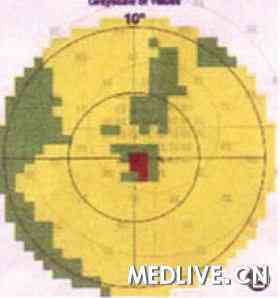 图1:上图依次为A、B、C、D、E、F。性连锁青少年视网膜劈裂症患者(例1)眼底检查图像A(右眼)和B(左眼)示彩色眼底图像,显示黄斑中心区呈现棕红色囊样改变,周围呈网格状改变;c(右眼)和D(左眼)示相干光断层扫描图像,显示黄斑中心凹轻度隆起(M),囊泡位于视网膜神经纤维层(NFL)、内核层(INL)及光感受器层(PRL),并被条状组织分开;E(右眼)和F(左眼)示视野检查图像,显示双眼视野均有1个相对中心暗点。