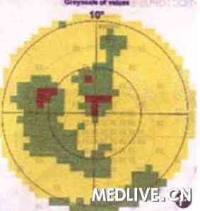 荧光素眼底施管造影:双眼黄斑区均无异常荧光及荧光素渗漏。相干光断层扫描:双眼黄斑中心凹位置偏下。右眼黄斑中心区视网膜厚度270μm,左眼黄斑中心区视网膜厚度276 μm。在视网膜神经纤维层、内核层、外丛状层均可见大量囊泡,被垂直或斜行的大小、粗细不同的条状组织分开(图2D,E)。视野检查:右眼正常。左眼有1个约20中心暗点。临床诊断:性连锁青少年视网膜劈裂症。2010年6月21日复查,自诉怕光。右眼视力0.3,小孔镜0.5;左眼视力0.3,小孔镜0.4。散瞳查眼底,双眼黄斑中心凹无明显变化,周边部同前。相干光断层扫描:右眼黄斑中心区隆起,囊泡变大,中心区视网膜厚度增至375μm;左眼改变同右眼,黄斑中心区视网膜厚度增至459μm。