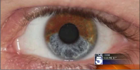 美国医生研发出一种眼睛变色技术,通过去除虹膜前部的褐色素,让褐色眼睛变成蓝色。在这幅图片中,眼睛下半部分的颜色已经发生变化