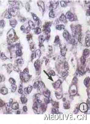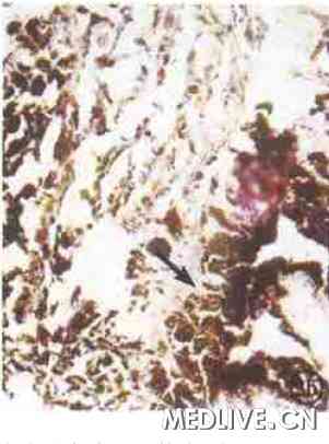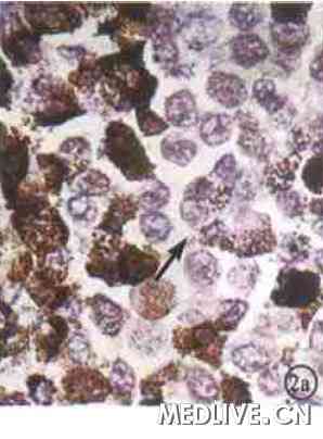 图1 例1组织病理学光镜像。肿瘤细胞呈弥散分布, 呈上皮样型, 散布少量色素。胞核大, 有明显异形性, 核膜粗糙, 核质呈泡状, 核分裂较少 HE×400 图2a 例2组织病理学光镜像,肿瘤细胞呈立方状, 胞浆大量色素颗粒 HE×400