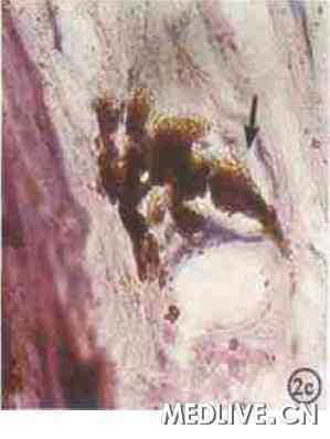 图2b 例2组织病理学光镜像, 部分睫状体受累HE×100图2c 例2组织病理学光镜像,巩膜血管间隙有肿瘤细胞浸润 HE×400
