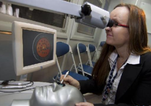 11月17日,在加拿大多伦多,一位医生在奥比斯眼科飞机医院专机检查室内进行模拟实验。当日,奥比斯眼科飞机医院专机抵达加拿大多伦多,开展为期3天面向公众的开放参观活动,希望藉此提高公众对世界抗盲工作的关注和支持。奥比斯眼科飞机医院于1982年成立于美国休斯敦,是非盈利志愿机构,现有500多名眼科医疗义务工作者,至今已到过包括中国在内的89个国家和地区展开治疗,培训了近30万医生和护理人员,为1500万名患者进行了治疗。
