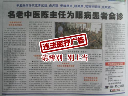 从北京市卫生监督所获悉,2011年11月8日,北京市卫生监督所对某日市场公开发行的20余种平面媒体刊登的医疗广告进行了抽查,发现北京京师眼科违规发布的医疗广告。
