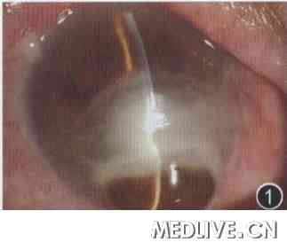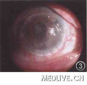 图1入院时,裂隙灯显微镜下观察感染性结晶状角膜病变患者右眼,可见角膜中、