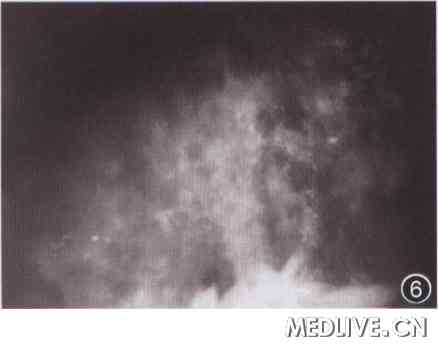2010年4月23日,眼部检查:右眼视力眼前指数,结膜混合性充洫(++),角膜植片大片上皮缺损,雪花状混浊边界变模糊,下方成片状融合溃疡形成,累及植床,10至12点方向植床浸润,前房欠清,下方可见线状积脓(图7)。建议患者行二次角膜移植术,患者及其家属要求保守治疗,带药出院。