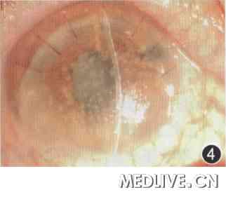 图4裂隙灯显微镜下观察感染性结晶状角膜病变患者,