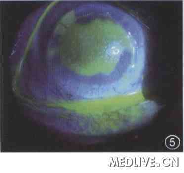 图5裂隙灯显微镜下观察感染性结晶状角膜病变患者荧光素染色,