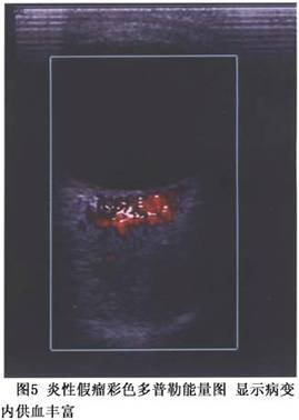 显示有些病例病变内供血丰富,有较多的彩色血流信号,呈弥漫形,或呈管状。有些血流为动脉频谱,有些病变则血流信号很少。