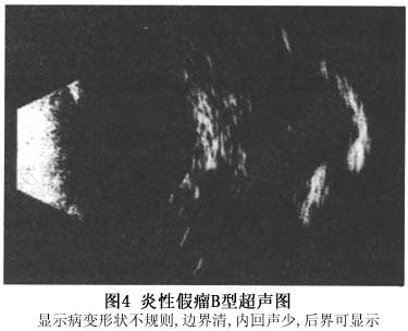 由于组织内有较多细胞浸润,在细胞和间质之间形成反射界面,在不同部位细胞与间质比例不同,因此反射回声多少不同。A型超声呈低小波形或缺乏波形,后界为高尖波。B型超声显示眶内病变大小不等,形状不规则,边界尚清,内回声少或中等,声衰减中等,后界可显示