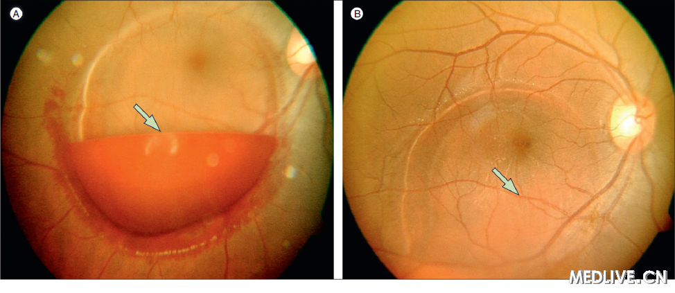 经查右眼视力20/200,左眼视力20/20。右侧眼底检查提示黄斑前玻璃体膜下新月形出血(附图A)。全血细胞计数、凝血酶原时间及活化部分凝血活酶时间均在正常范围内。行Nd:YAG激光玻璃体切开术治疗,3个月后患者右眼视力提高至20/40(附图B)。