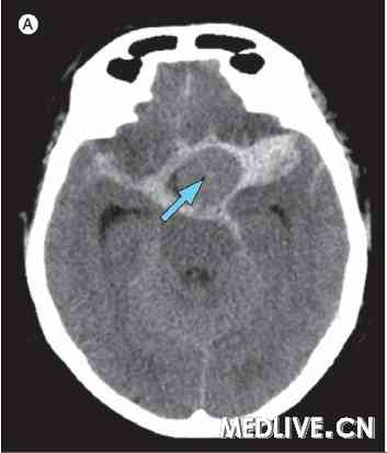C图:螺旋扫描图像显示,出血进入蛛网膜下腔 |