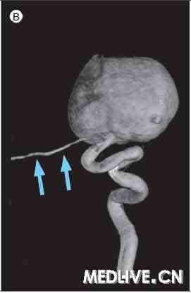 B. 颈内动脉-眼动脉瘤的三维影像,起自囊腔的眼动脉(箭头)