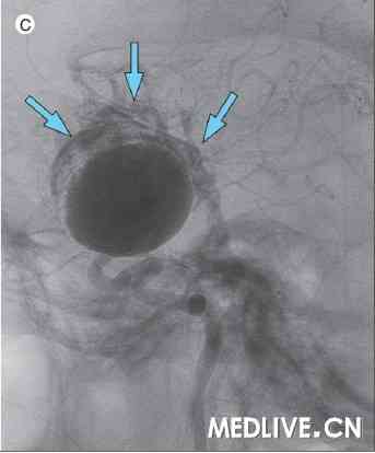 为进一步明确诊断并制订治疗方案,在全身麻醉下行血管造影。左颈内动脉注射造影剂后显示出一个缓慢充盈的巨大颈内动脉-眼动脉瘤(附图B)。