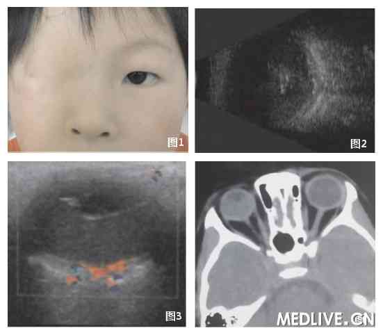 图1 患者外观像;图2 有眼B超;图3 有眼彩色多谱勒 ;图4 眼眶CT