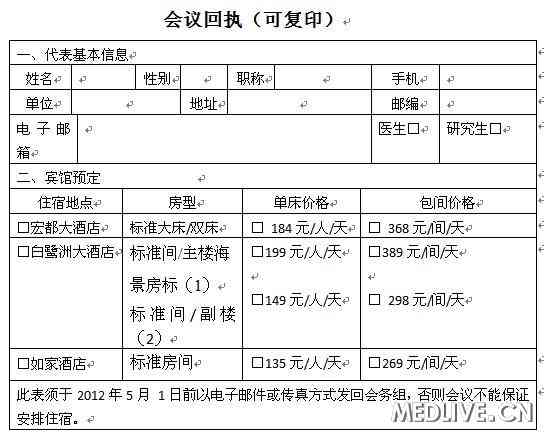 此表须于2012年5月 1日前以电子邮件或传真方式发回会务组,否则会议不能保证安排住宿。