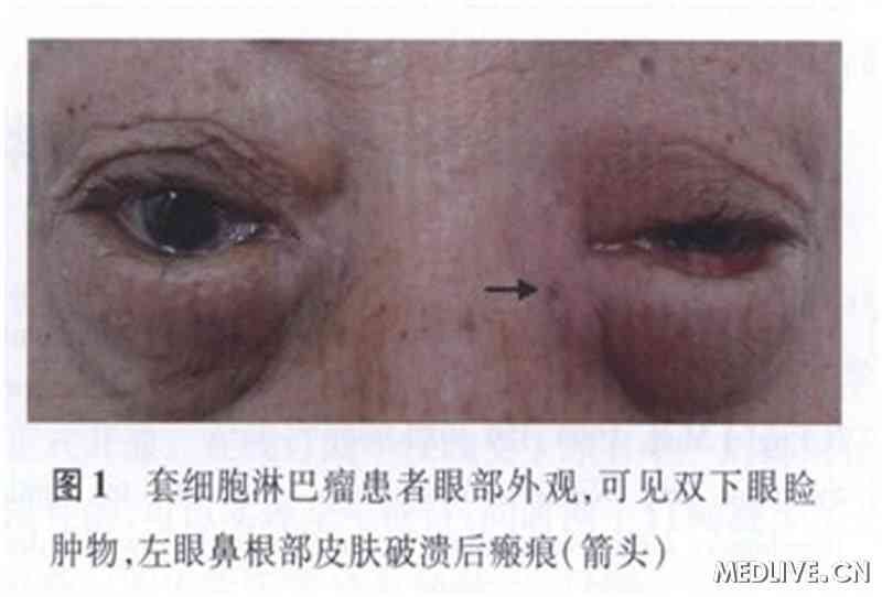 眼附属器出现无痛性肿物时,应做相应的眼局部及全身检查,必要时行活检术以争取早期诊断。本例患者因双眼睑肿物首诊于眼科,综合考虑高龄男性,并且伴有全身多处淋巴结肿大,拟诊为双眼睑、眼附属器淋巴瘤,经过病理学检查证实为套细胞淋巴瘤。因此,眼科医师认识套细胞淋巴瘤的眼部表现特征可争取早期诊断与治疗。