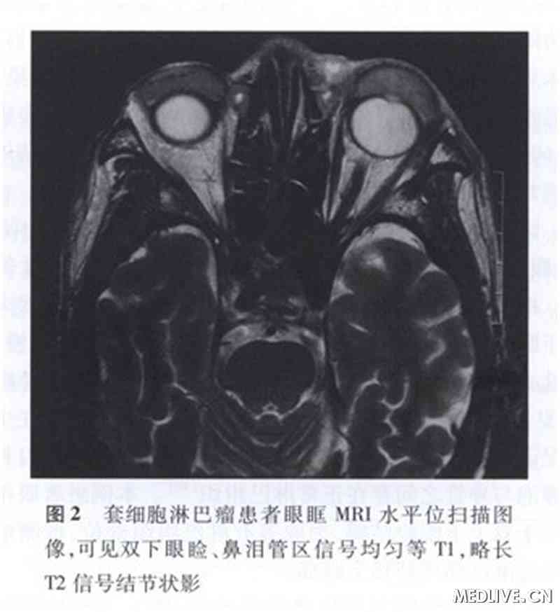 眼部检查:右眼视力0.8,左眼视力0.5;右眼眼压11 mm Hg(1 mm Hg =0.133 kPa),左眼眼压12 mm Hg;双眼球向下运动不过中线,余各方向运动未见异常;双眼泪腺区可触及不光滑肿物,中等硬度;双下眼睑明显隆起,可触及蚕豆大小肿物(图1),中等硬度,右侧压痛(+);左上眼睑下垂,遮挡1/2瞳孔,眼睑皮肤红,轻度肿胀,鼻根部明显,可触及一个边界不清楚的结节,压痛明显:双眼下方球结膜水肿隆起,左眼可见一个出血点;右眼鼻侧结膜下组织增生,侵入角膜缘约2 mm;双眼前房深度正常,前房闪辉及浮游体均阴性;双眼晶状体皮质轻度混浊;散瞳眼底检查未见异常。眼部B超检查显示双眼睑及泪腺区中低密度、室隔状回声。眼部MRI检查可见双侧泪腺、鼻泪管区和上下眼睑内信号均匀等T1、略长T2信号结节状影(图2)。