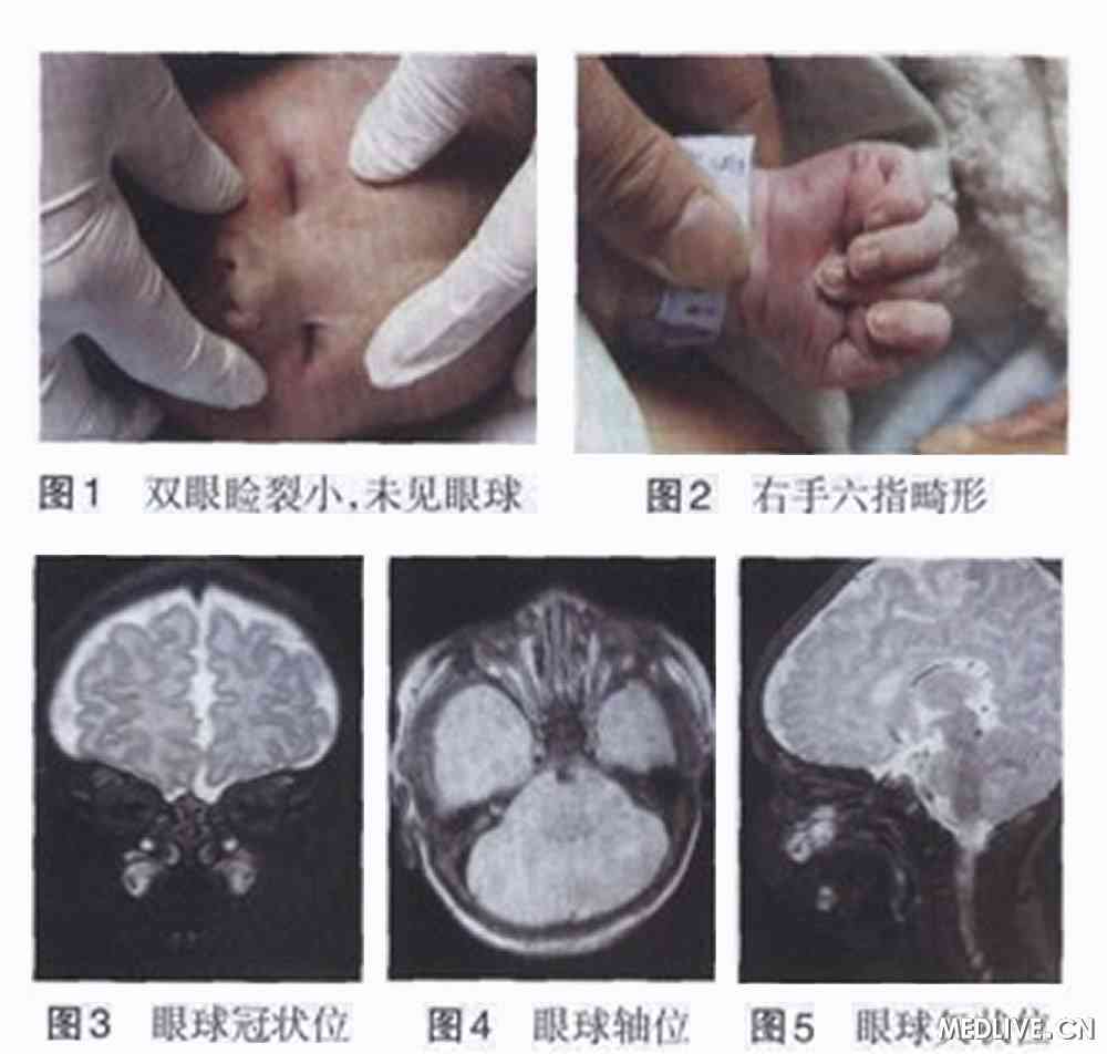体检:头颅正常,五官位置正,双侧眉毛存在,双眼上、下睑存在,眼睑内陷,颞侧睑裂闭锁,鼻侧睑裂宽约3-4 mm,结膜囊浅、窄,未见眼球结构样组织。眶区凹陷,触之柔软,其内未扪及硬结组织(图1)。心肺未见异常。右手六指畸形(图2),余躯干、四肢正常。