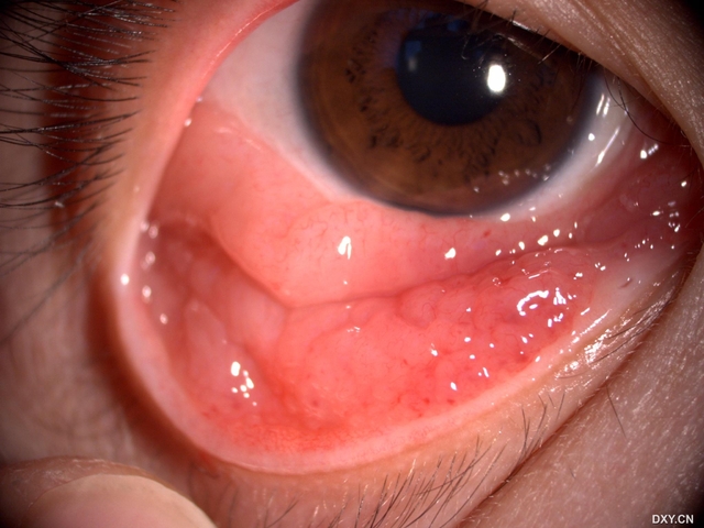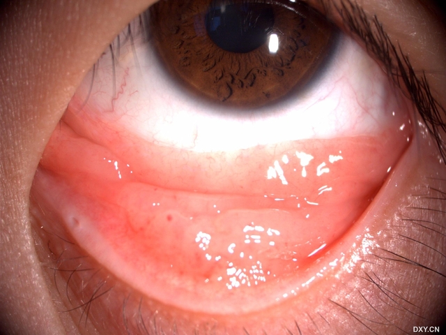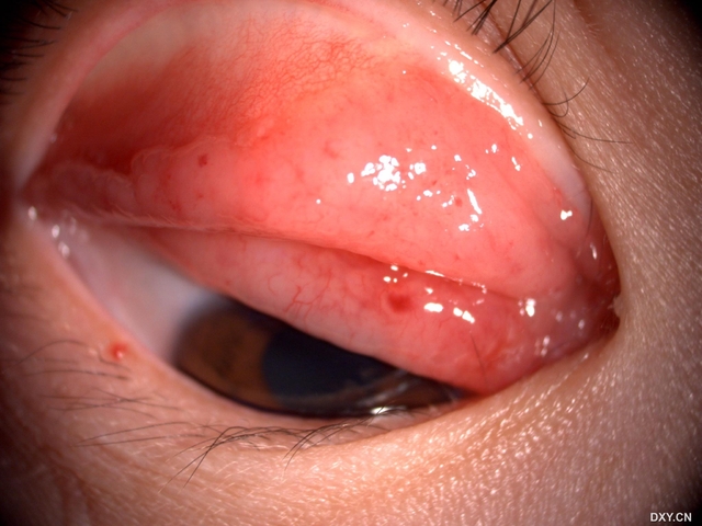 见双眼下睑结膜铺路石样乳头增生,穹窿结膜形似结膜松弛样,结膜皱褶隆起突出,粉红色,血管少见,右上睑结膜同样组织增生,但可见其为匍行性生长肿物,边界清晰,左眼上睑结膜阴性