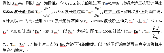 方法:通过对患者进行异常三色觉的测定,计算出色觉矫正值,给患者佩戴根据矫正后的光谱曲线设计的矫正眼镜,使色觉趋于正常。1.通过电脑色觉检测仪测量出患者的三基色异常值Rn′、Gn′、Bn′;2.A种各类异常三色觉以最小的异常值为标准,