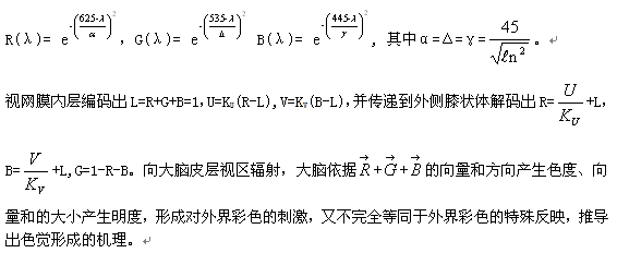方法:根据机能解剖学和临床解剖学的科研成果:视网膜层次把入射人眼的彩色光谱入传三种感光视锥细胞产生光刺激R(λ)、G(λ)、B(λ),并在视网膜层次调解出亮度信号L和色差信号U、V,通过神经节细胞和神经纤维、视交叉、视束传递到外侧膝状体对应细胞层,并在此解码出三基色值R、G、B,向大脑皮层视区辐射,大脑依据三基色产生色觉,整个色觉过程是以点对点的拓扑方式传递,使外界光谱彩色与色觉彩色一一对应。色觉研究是多学科综合,更适合用数学方法进行定性定量研究:入射人眼的外界彩光,激活色素上皮层的色素颗粒,并以其数量级与λ一一对应使视锥细胞分别产生光刺激值,当三基色值归1化后,