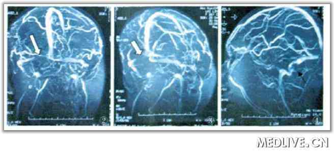 给予甘露醇250ml快速静滴,2次/日,甘油果糖250ml静滴,1次/日,治疗2曰后患者头痛未见好转,夜间加重。治疗第三日加用低分子肝素66mg皮下注射,1次/日,使用3天;尿激酶100万单位静滴,1次/日,共使用10天。用尿激酶的第9天加用华法林,华法林第1、2、3天用量分别为7.5mg、5mg、2.5mg,降至2.5mg时维持6-12月,服药期间注意监查凝血常规。