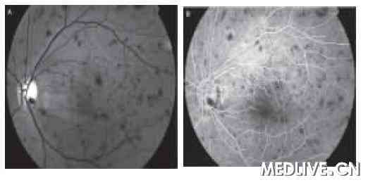 图1 FFA检查 A:无赤光造影,静脉略粗,大量点片状深层出血点;B:动静脉充盈时间30s