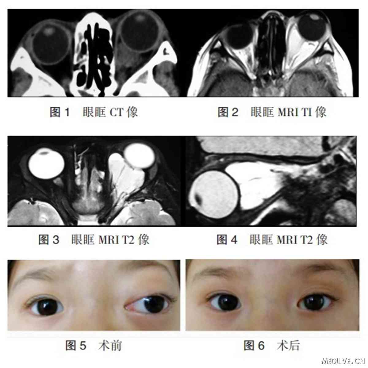 眼眶MRI:提示左眼球向前外移位,突出,球后可见锥形短T1长T2信号,包绕视神经,沿视神经扫描未见视神经增粗,肿块内可见液平,液平上方呈高信号(图2、3、4)。