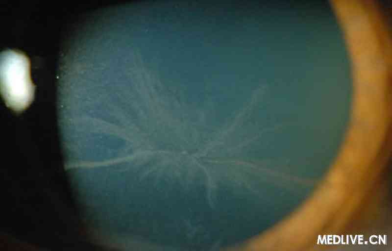 双眼结膜无明显充血,角膜上皮见数条线形棕色颗粒沉着,呈涡状(图1),角膜荧光染色(-),前房深浅大致正常。房水清,虹膜纹理清,瞳孔正圆,直径约3 mm,直接及间接对光反射( + ),晶状体皮质混浊,眼底未见明显异常。