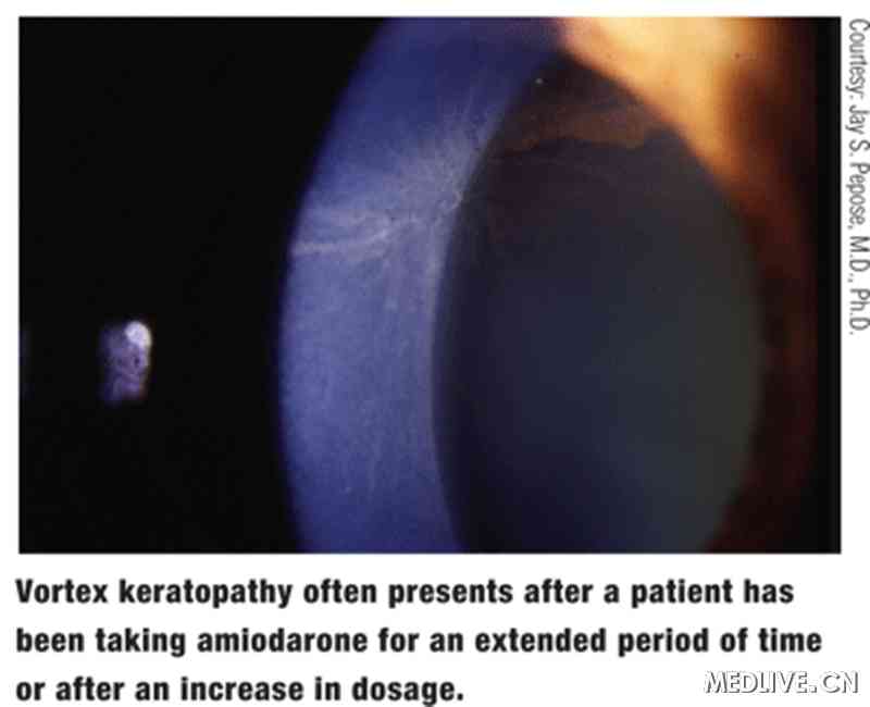 眼部异常反应主要表现为视物模糊、异物感、虹视、绿视、畏光等症状及涡状角膜病变、晶状体前囊色素沉着、黄斑变性、视神经炎、视乳头水肿、干眼症等体征。 其中以涡状角膜病变最常见,Dovie等报道涡状角膜病变可见于所有经胺碘酮治疗6个月以上的患者。眼部最严重的损害是视神经炎,一旦发现必须立即停药。如眼部异常反应仅表现为涡状角膜病变,且早期角膜仅有少量微粒沉积时,若不进一步追问病史,易误诊为角膜炎或角膜营养不良。