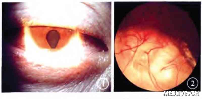 双眼角膜透明,6点钟位虹膜缺损,瞳孔呈梨形(图1),晶状体点状混浊,玻璃体混浊,眼底检查发现,双眼视盘边界不淸,大于一个象限的脉络膜缺损,透见下方巩膜(图2)。