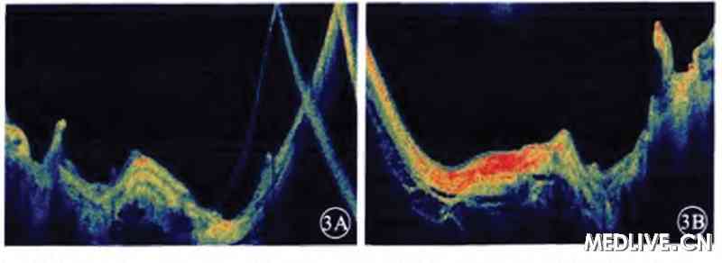 3B:左眼黄斑中心凹存在,黄斑区鼻侧神经上皮层浆液性脱离。双眼神经上皮层明显变薄,