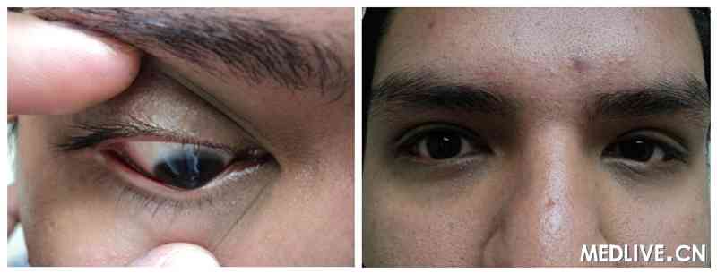 患者,24岁,男性,双眼视力差,右眼:指数,左眼:20/400(0.05)他的形貌如上图。在检查前,你注意到他在向下注视的时候,右眼眼睑的裂隙(下睑缘)。
