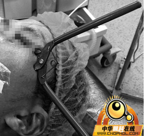 医生说,剪刀一端插入老吴的左眼球,深3厘米,另一端从距左侧太阳穴0.5厘米处插入,只留着10多厘米的剪刀柄在外面(如图)。幸运的是,剪刀没有伤及颅脑大血管,否则会危及生命。经手术,剪刀已被顺利取出,老吴的视力昨天也已恢复至4.6(正常视力为5.0)。