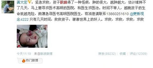 “紧急求救,孩子眼睛得了一种怪病,肿得很大,越肿越大,微博急寻医生。”27日中午,一条求助微博被网友转发近万次。龙岩一名刚满1周岁的女童患上怪病,左眼肿大如球。她的父亲辗转多个城市求医,无奈无法确诊女儿的病情。