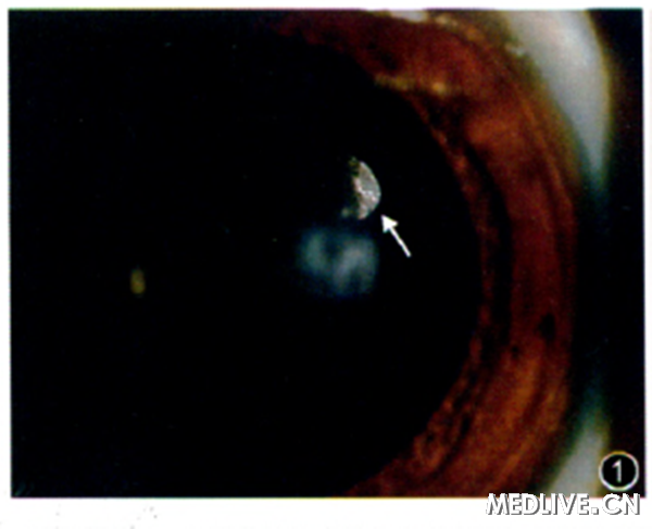 图片1 左眼晶状体内异物患者裂隙灯显微镜下晶状体内颞上方可见片状金属异物(箭头) ×40