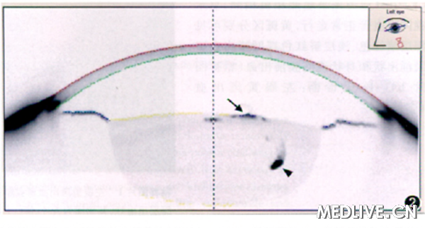 图片2 左眼晶状体内异物患者Pentacam眼前节分析仪检查图像,晶状体内颞侧可见异物影(三角),晶状体前囊膜和前皮质局部混浊(箭头) |