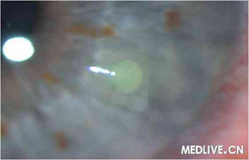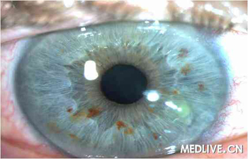 眼科检查,右眼最佳矫正视力为20/25,左眼为20/20, 有轻度近视合并散光。眼内压、瞳孔检查、对比视野检查都正常。眼前段检查显示右眼有睑板腺处凝结和白内障形成,见于照片。左眼检查正常。