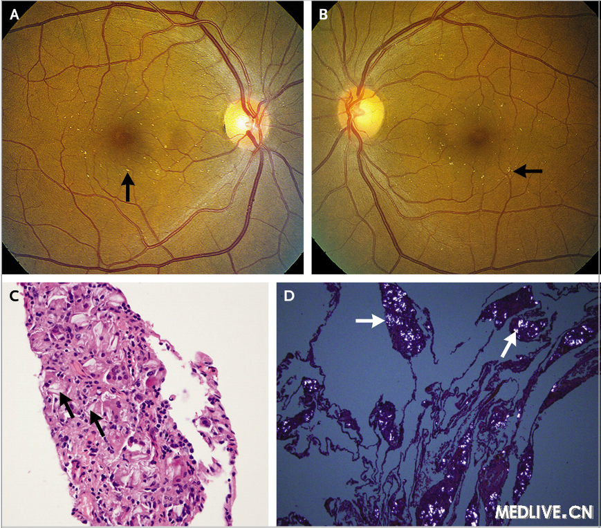 一名56岁的女性,双眼黄斑处视网膜发现细小结晶体(图A、图B),但未显示出临床症状。曾经因为慢阻肺接受过双肺移植。