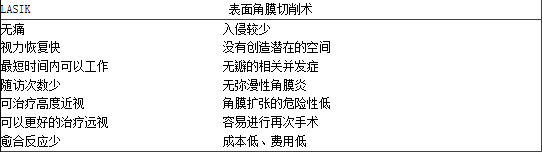 PRK术后疼痛和视力恢复慢的缺点使许多患者对其感到失望,相反LASIK术后无痛苦、视力恢复快并且可以治疗高度近视,所以LASIK已在全世界普及并成为许多患者的首选术式,LASEK和Epi-LASIK的出现仅是PRK的卷土重来。Kirwan和O’Keefe对年龄、瞳孔直径、屈光度、切削深度和光学区无差异的患者分别行LASEK和LASIK,发现术后两组视觉效果相似、并发症发生率无差异,但LASIK组的高阶像差和4阶慧差显著增加。表面角膜切削术和LASIK都有各自明确的适应症,并且有各自的优点(见表1),但表面角膜切削术可以避免LASIK角膜瓣的相关并发症。虽然随着科学技术的发展,目前屈光手术已经得到了很大改进,但是由于缺乏长期的前瞻性随机对照试验,还不能对表面角膜切削术和LASIK进行有效比较。
